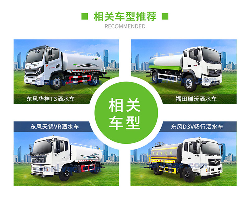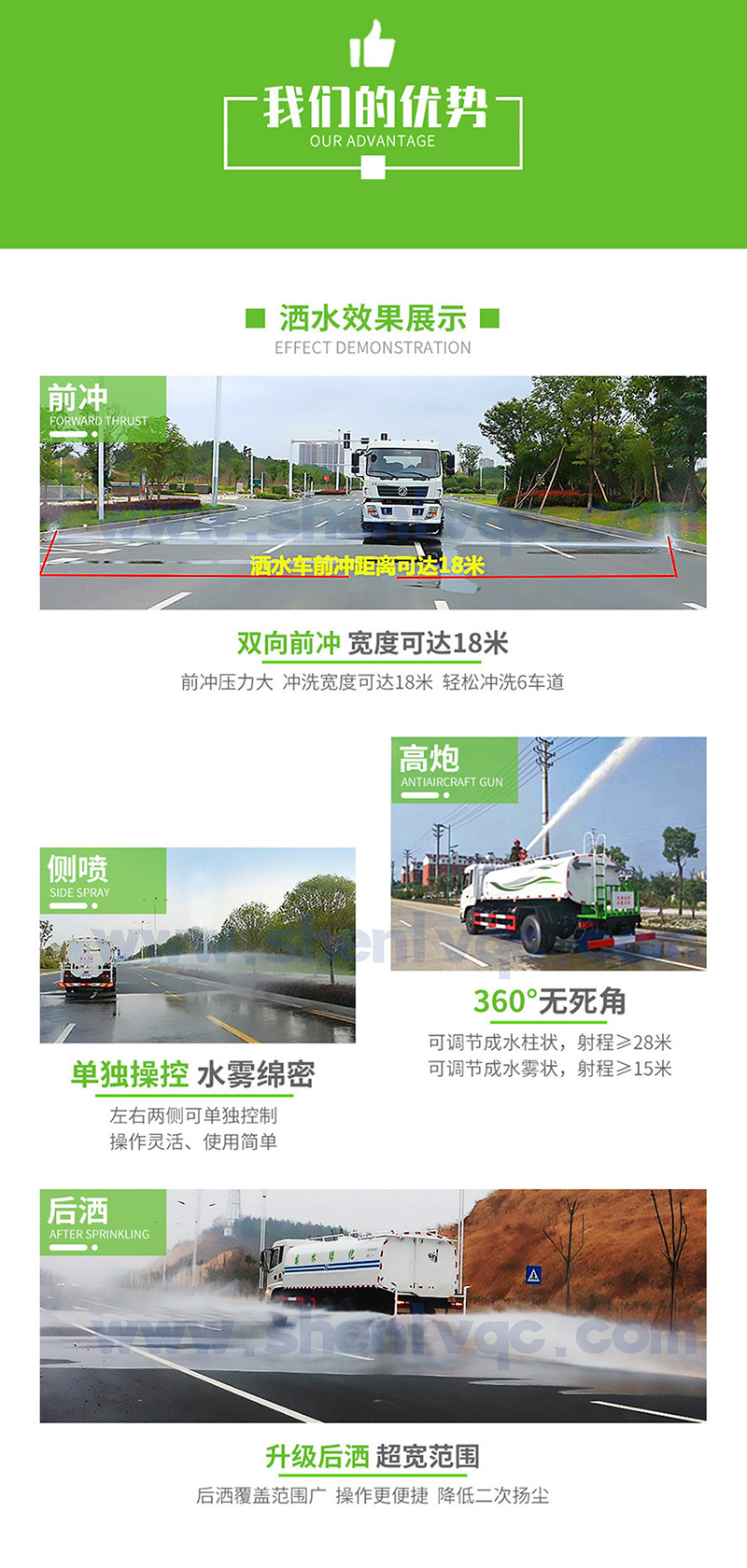 ①大鴨嘴前沖噴頭,萬向前沖球閥;②選裝氣動球閥駕駛室內控制;③選裝自動灑水炮;④選裝LED箭頭燈,長條警燈;⑤選裝食品級304不銹鋼罐體;⑥選裝后加大工作平臺+霧炮機組;⑦選裝新款標準化外形。 |