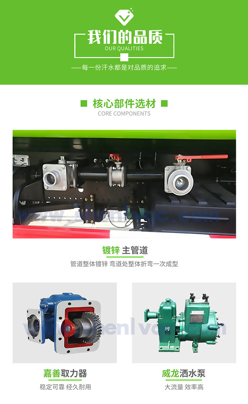 前沖、后灑、側噴、后平臺高炮、自流閥、消防接頭、濾網、噴頭、帶自吸自排、全功率取力器、音樂喇叭 |