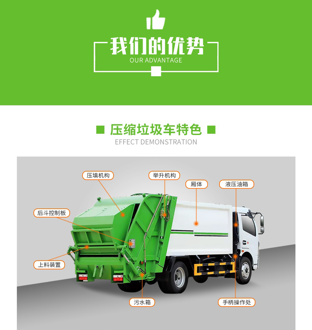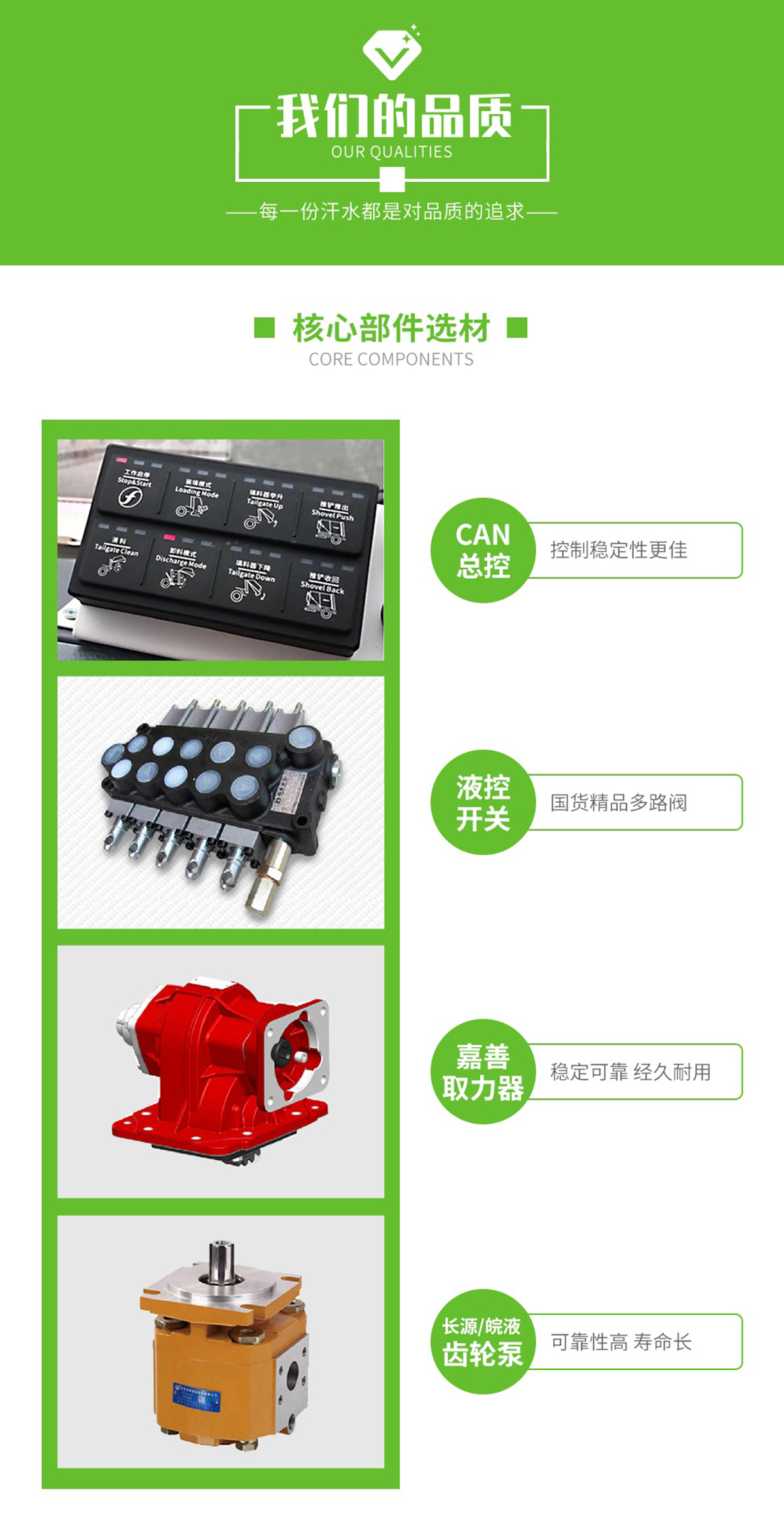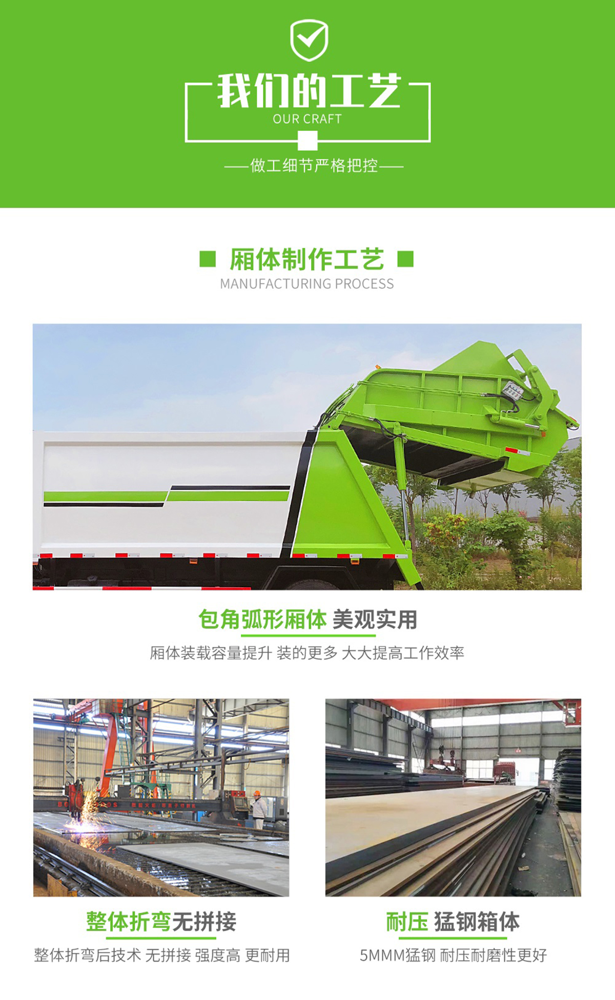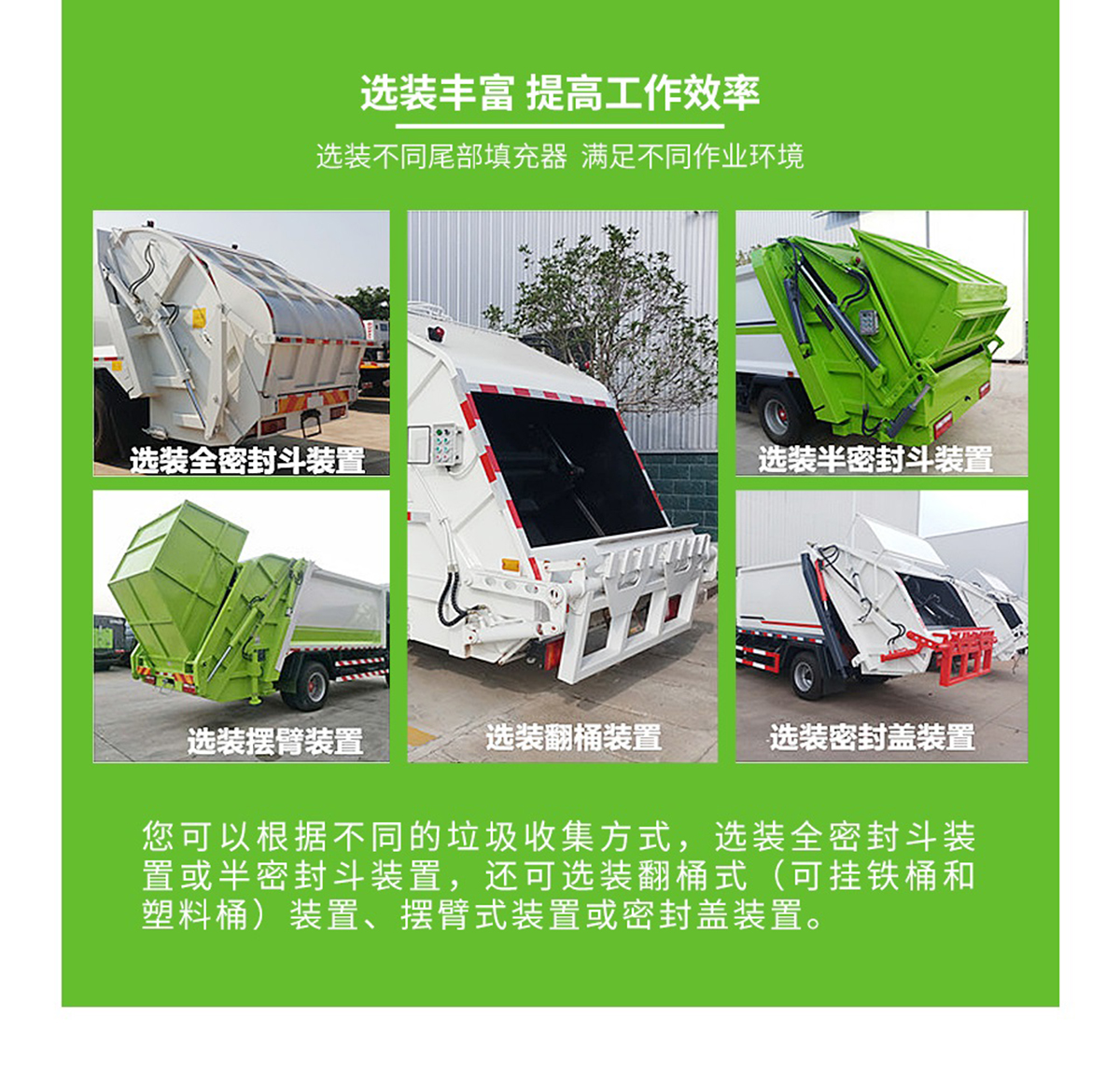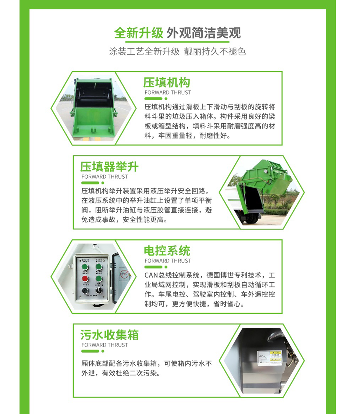 | 基本配置: | 底盤配置: 配置一:云內150馬力,萬里揚6檔變速箱,前橋2.2噸,后橋4.2噸,8.25鋼絲胎,斷氣剎,ABS,空調,氣囊座椅,電動窗,中控鎖。 配置二:玉柴165馬力,萬里揚六檔箱,190mm雙層大梁,8.25R20鋼絲胎,2.4/6前后橋,帶空調,氣囊座椅,遙控鑰匙,行車記錄儀。 上裝配置:1,新款弧形箱體,增加箱體容積,整車更美觀,箱體為碳鋼制作,底箱及填充器采用加厚鋼板,耐腐蝕使用壽命長,一層油漆噴涂處理。2,裝載循環時間=25S;垃圾排出時間≤25S;填料提升角度≥95°,壓縮比例為1/3-1/2,一裝部分具備雙向壓縮和蠕動壓縮功能帶。3,新款結構加大填充器,手電一體操作模式,帶駕駛室操作,帶駕駛室一鍵卸料功能,3308軸距以上配遠距離遙控器,尾部裝置可以選裝垃圾翻轉斗,掛桶翻轉板或者大落地斗。4,CAN總線控制方式,光電開關加延時雙系統控制,降低故障率,方便維修。5,帶夜間照明裝置,6方)及以上車型帶雙污水箱,污水箱排水球閥和排水蓋,增加排水管,防止濺水,人性化設計。6,標配選用:威森搏樂油缸,威森搏樂多路閥,3308軸距以上配備壓實閥(背壓閥),所有車型標配單泵。5000軸距、后八輪車型標標配雙聯泵,大油量多路閥。 選裝配置:大落地斗,帶后擺臂,另帶單一掛桶裝置,尾部密封蓋手動/氣缸控制,雙聯泵(多路閥聯數增加,液壓泵加大,液壓油箱加大)。 | ||