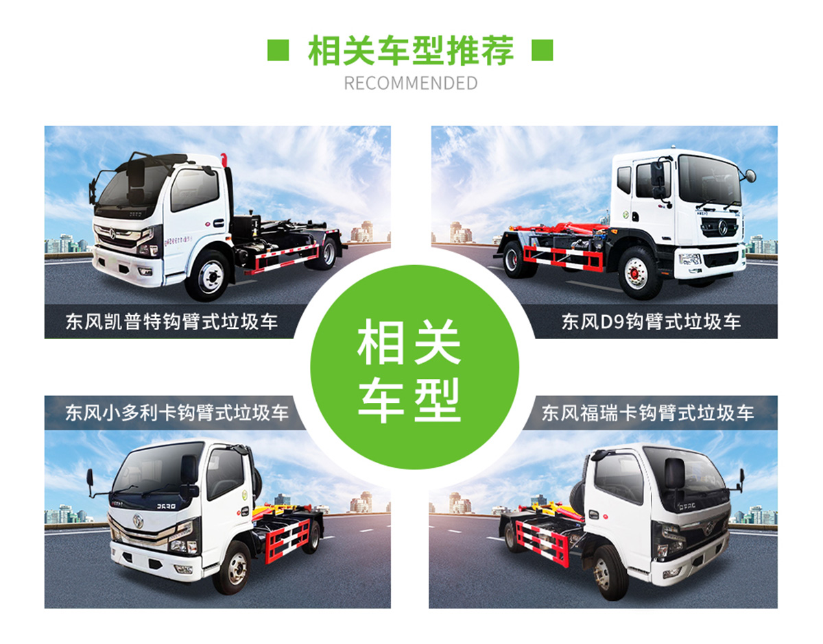 上裝配置:配套12~14方勾臂垃圾箱,主勾臂由高強度板材制作,雙油缸,國產多路閥,液壓油泵,標配駕駛室外部操作,可選裝駕駛室室內操作,選裝液壓后支腿,防誤操作,帶平衡閥,液壓鎖。